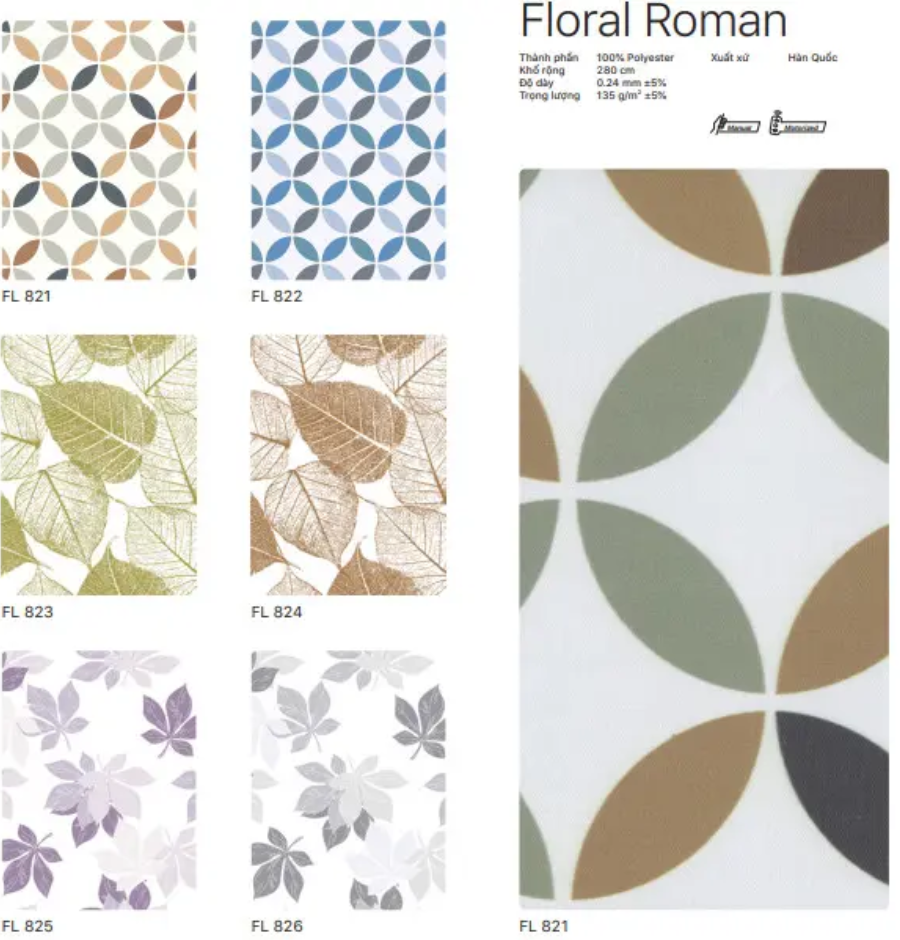 Với mẫu rèm này, bảng màu Floral Roman có 6 mã màu đa dạng FL821, FL822, FL823, FL824, FL825 và FL826 giúp khách hàng dễ dàng lựa chọn màu sắc cũng như họa tiết mà mình yêu thích.