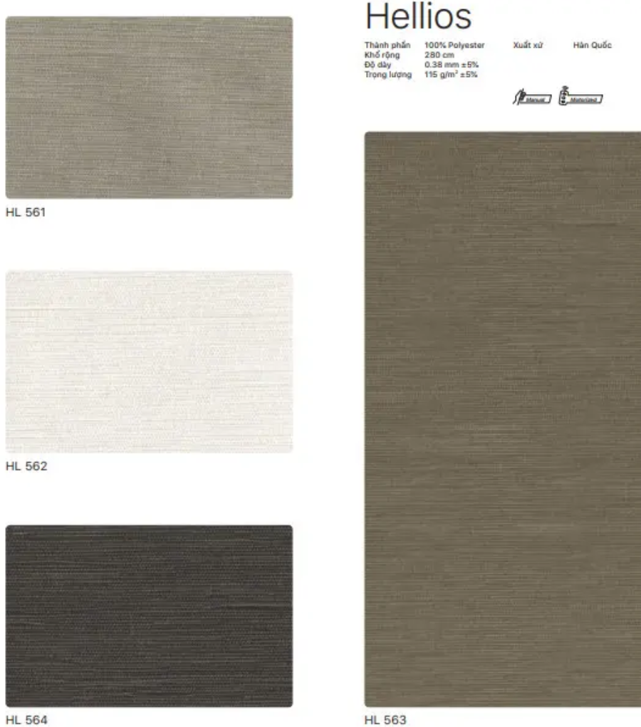 Rèm gồm có 4 mã màu (HL561 - màu xám, HL562 - màu trắng, HL563 - màu nâu và HL564 - màu đen). Các tông màu trung tính này sẽ giúp quý khách dễ dàng lựa chọn màu mình thích, phù hợp với tất cả không gian. Dưới đây là bảng màu của rèm:
