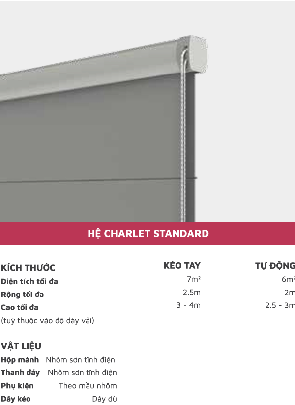 - Hệ Charlet Standard: Là sự kết hợp giữa phong cách hiện đại và cổ điển, mành Roman Charlet Standard mang đến cho bạn cuộc sống tiện nghi.