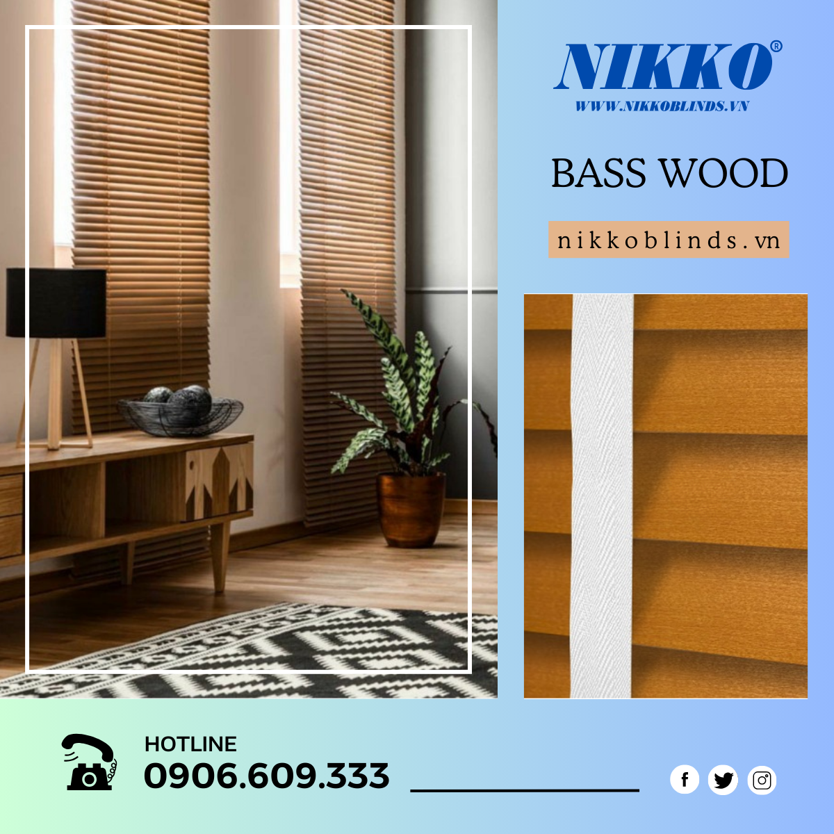 - Rèm gỗ BASS WOOD được làm từ gỗ tự nhiên có độ bền cao, thiết kế bề mặt nhẵn bóng với các đường vân gỗ nhẹ nhàng.